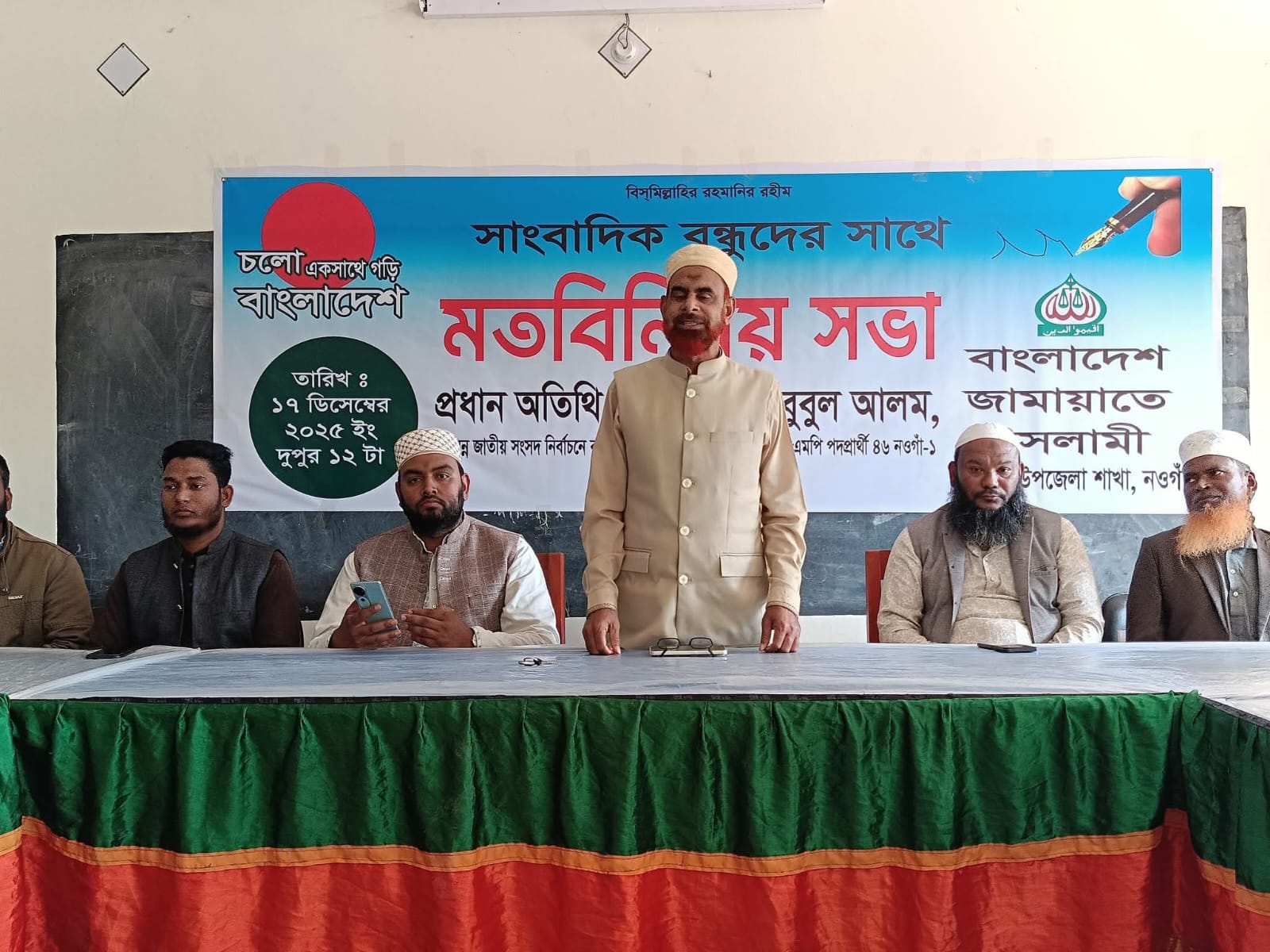 নাইম: নওগাঁর পোরশায় সাংবাদিকদের সাথে নওগাঁ-১(সাপাহার-পোরশা-নিয়ামতপুর) আসনের জামায়াত মনোনীত সংসদ সদস্য প্রার্থীর মতবিনিময় অনুষ্ঠিত। উপজেলার বিভিন্ন সংবাদ মাধ্যমের কর্মীরা এতে উপস্থিত ছিলেন। বৃহস্পতিবার দুপুরে নিতপুর সিনিয়র ফাজিল মাদ্রাসা মিলনায়তনে বাংলাদেশ জামায়াতে ইসলামী পোরশা উপজেলা শাখার অয়োাজনে ওই মতবিনিময় সভায় প্রধান অতিথি হিসেবে বক্তব্য রাখেন নওগাঁ-১ আসনে বাংলাদেশ জামায়াতে ইসলামী মনোনীত সংসদ সদস্য প্রার্থী অধ্যক্ষ মাহবুবুল আলম। উপজেলা জামায়াতের সেক্রেটারী শরিফুল ইসলামের পরিচালনায় এতে সভাপতিত্ব করেন উপজেলা জামায়াতের আমীর মাওলানা সাগর আলী। এসময় উপজেলা জামায়াতের যুগ্ম সেক্রেটারি নুর নবী, উপজেলা ওলামা মাসায়েখ সভাপতি মাও: আলাউদ্দিন আলী, নওগাঁ জেলা ছাত্র শিবিরের সেক্রেটারী আজাহারুল হক, শ্রমিক কল্যাণ ফেডারেশনের উপজেলা সভাপতি ইয়াদুল হক ও কর্মপরিষদ সদস্য আমিনুল ইসলাম। সংবাদ কর্মীদের সাথে মতবিনিময়কালে অধ্যক্ষ মাহবুবুল হক নওগাঁ-১ আসনের তিনটি উপজেলা সাপাহার-পোরশা-নিয়ামতপুরকে বৈষম্যহীন, কল্যাণকর ও উন্নয়নের সংসদীয় আসন হিসেবে গড়ে তোলার আশাবাদ ব্যাক্ত করেন।